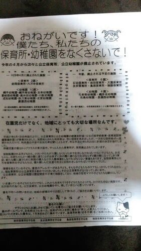 東大阪市で「公立の就学前教育・保育施設再編整備計画」が進められています。 しかし、市の不十分な説明などにより困惑している保護者たちが行動を起こしています。 また、日本共産党も動きを見せています。 これで子どもにやさしいまちづくり? 公立の就学…