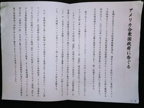 我が愛国社会主義運動の大アジア主義戦線である興亜維新義勇軍は駐大阪アメリカ総領事館に対し抗議文を送付した。 アメリカ合衆国政府に告ぐる 良識ある在日アメリカ総領事館職員諸兄、諸兄もよくご存知のように貴国のトランプ大統領はイラン・イスラム共和…