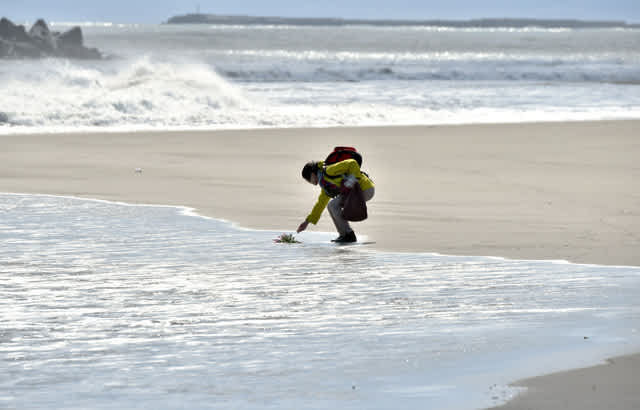 さいたま市から慰霊のため訪れた女性(61)は波打ち際にユリと菊の花束をそっと置き、手を合わせた。「つらい思いをして亡くなられた方の冥福と、生きている方を見守ってくれるよう祈りを込めた」と話した=10日午後、仙台市若林区の荒浜地区、戸村登撮影