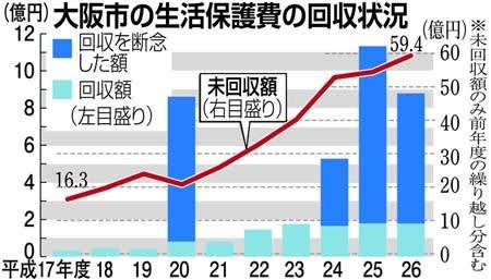 生活保護費の受給率が全国の市町村で最も高い大阪市が、平成26年度までの10年間に不正受給者らに返還を求めた保護費約98億円のうち、約3割の約28億円の回収を断念していたことが9日、分かった。一方、回収できた額は約11億円にすぎず、26年度時点での未回収額は約59億円にのぼる。自治体は返還が不可能と判断すれば請求権を放棄できるが、その大半は国が補填(ほてん)する仕組みで、国は回収の徹底を求めている。