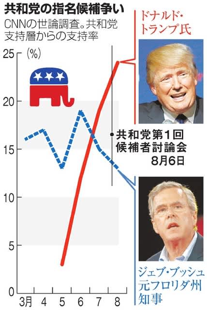 来年11月の米大統領選に名乗りをあげた共和党のドナルド・トランプ氏(69)の勢いが止まらない。今月上旬の世論調査では、有力視されるジェブ・ブッシュ元フロリダ州知事(62)の倍近い支持率を獲得。人気を下支えしているのが、日本を含む国々に対する強硬な発言だ。