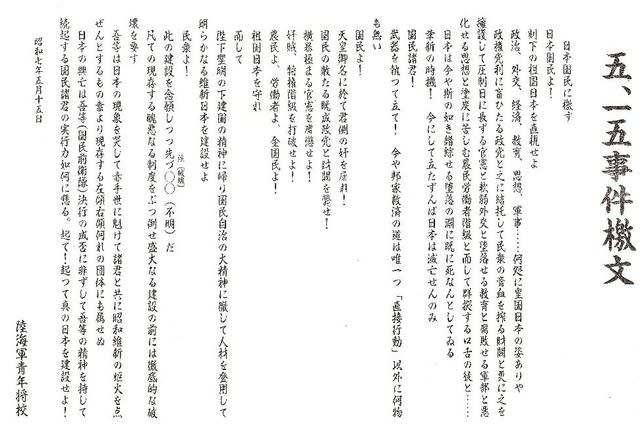 吾等は日本の現状を哭して赤手に魁けて諸君と共に昭和維新の炬火を点ぜんとするもの。
