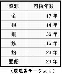 石油石炭だけでなく、さまざまな金属資源も今のままでは後十数年で枯渇するものもあります。枯渇が近づくとさらに品位の悪い(含有率の低い)鉱石から採掘、精製するため、より大量のエネルギーが必要になります。資源の枯渇によりエネルギーの枯渇がさらに早まる可能性があります。
