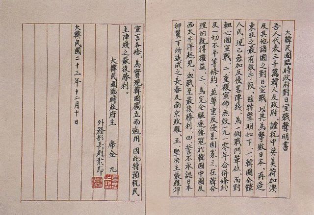 しかし、この宣戦布告に有効性はなく「韓国光復軍」も実戦に加わる間もなく戦争は終わった。