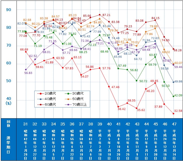 20代・30代の投票率の低さはサヨク傾向が多い団塊世代の投票の効果を高めてしまいます。
