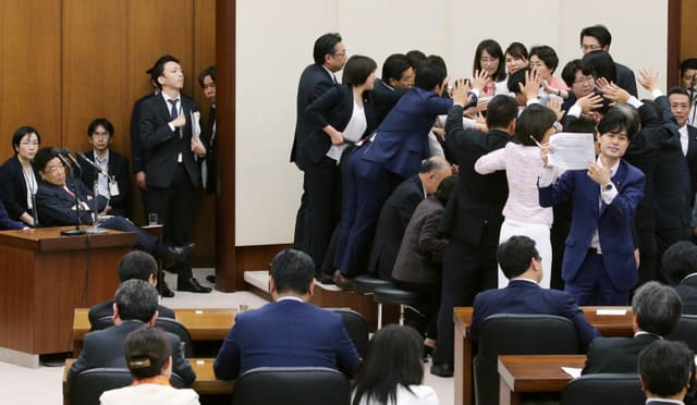 働き方改革関連法案の衆院厚労委での採決を野党議員らが阻止しようとするなか、行方を見守る加藤勝信厚労相(左から2人目)=2018年5月25日午後5時51分、飯塚晋一撮影