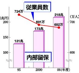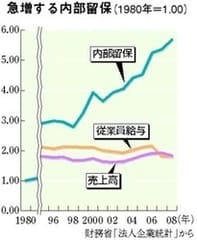 従業員がリストラされ、給与が減らされる一方で巨額の内部留保が蓄えられています。