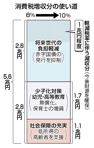 2%の消費税率引き上げで見込まれる税収増は約5兆6000億円。当初計画では4兆円強を赤字国債の発行抑制に充て、残りを高齢者支援を中心とする社会保障の充実に使う予定だった。