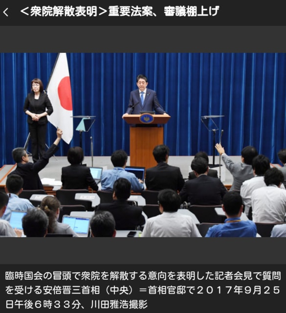 臨時国会の冒頭で衆院を解散する意向を表明した記者会見で質問を受ける安倍晋三首相(中央)=首相官邸で2017年9月25日午後6時33分、川田雅浩撮影